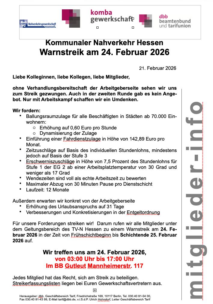 WARNSTREIK 24.02.2026 Von Arno Poka am 21. Februar 2026 Veröffentlicht in Aktuelles Arno Poka Mehr von AktuellesMehr Beiträge in Aktuelles »WARNSTREIK 19.02.2026TV-N Hessen Vertane ChanceWarnstreik 02.02.2026TV-N Verhandlungen Konstruktive AuftaktrundeStrombesteuerung Stromdeputat Absage