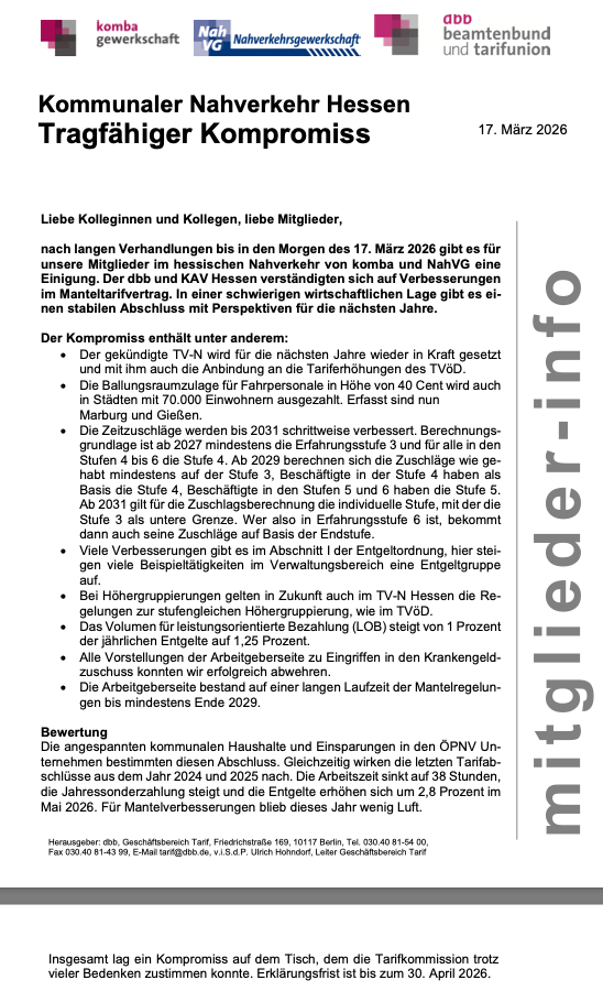 nach langen Verhandlungen bis in den Morgen des 17. März 2026 gibt es für unsere Mitglieder im hessischen Nahverkehr von komba und NahVG eine Einigung. Der dbb und KAV Hessen verständigten sich auf Verbesserungen im Manteltarifvertrag. In einer schwierigen wirtschaftlichen Lage gibt es einen stabilen Abschluss mit Perspektiven für die nächsten Jahre.
