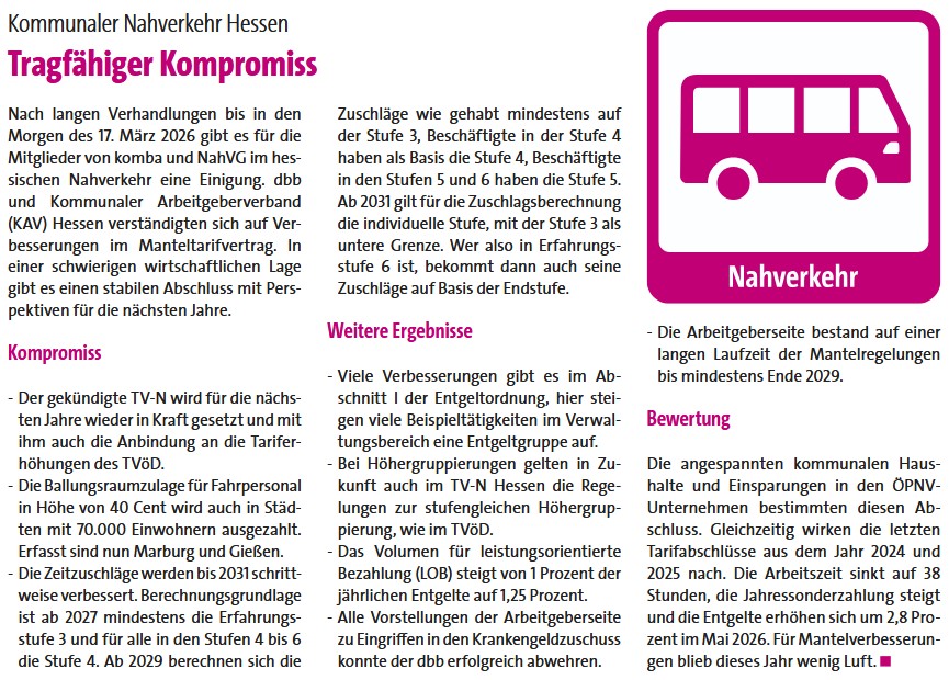 Nach langen Verhandlungen bis in den Morgen des 17. März 2026 gibt es für die Mitglieder von komba und NahVG im hessischen Nahverkehr eine Einigung. dbb und Kommunaler Arbeitgeberverband (KAV) Hessen verständigten sich auf Verbesserungen im Manteltarifvertrag. In einer schwierigen wirtschaftlichen Lage gibt es einen stabilen Abschluss mit Perspektiven für die nächsten Jahre.